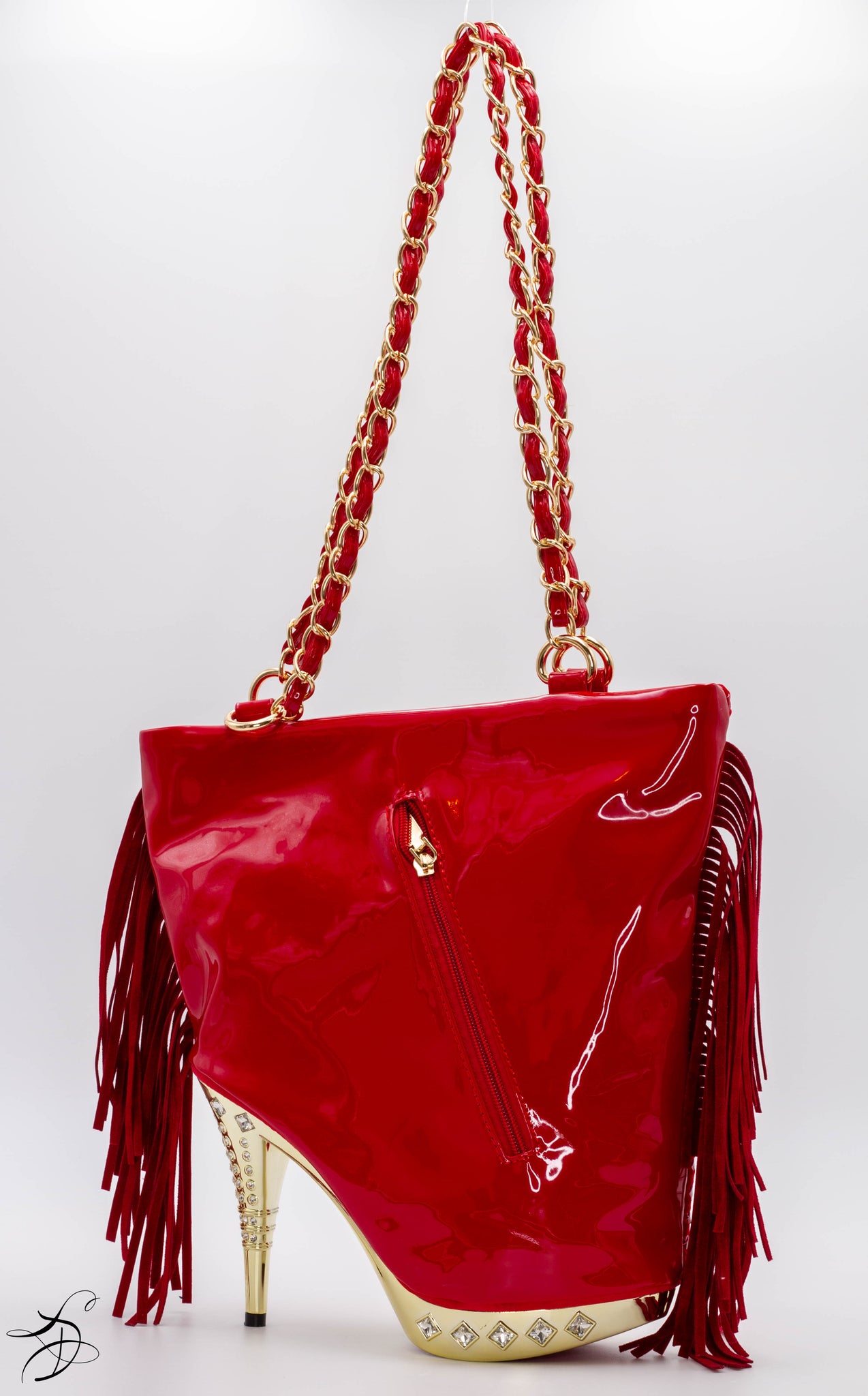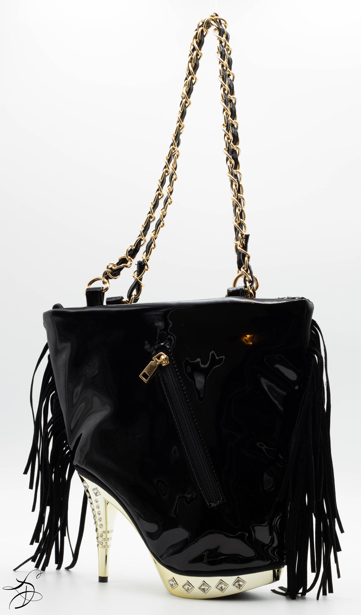 PATENT LEATHER SHOE HANDBAG WITH WAFFLE SUEDE FRONT WITH A SOLID PATENT LEATHER BACKING - INCLUDES GOLD CHAIN PURSE STRAP AND OUTSIDE DEEP POCKET FOR STORING. MEDIUM-LARGE SIZE HANDBAG