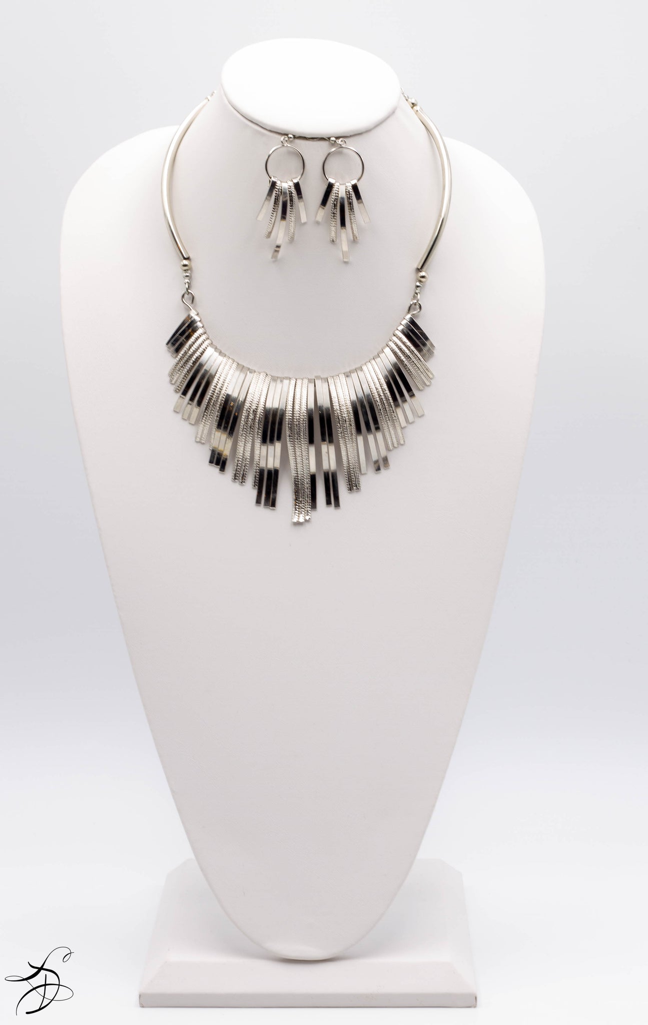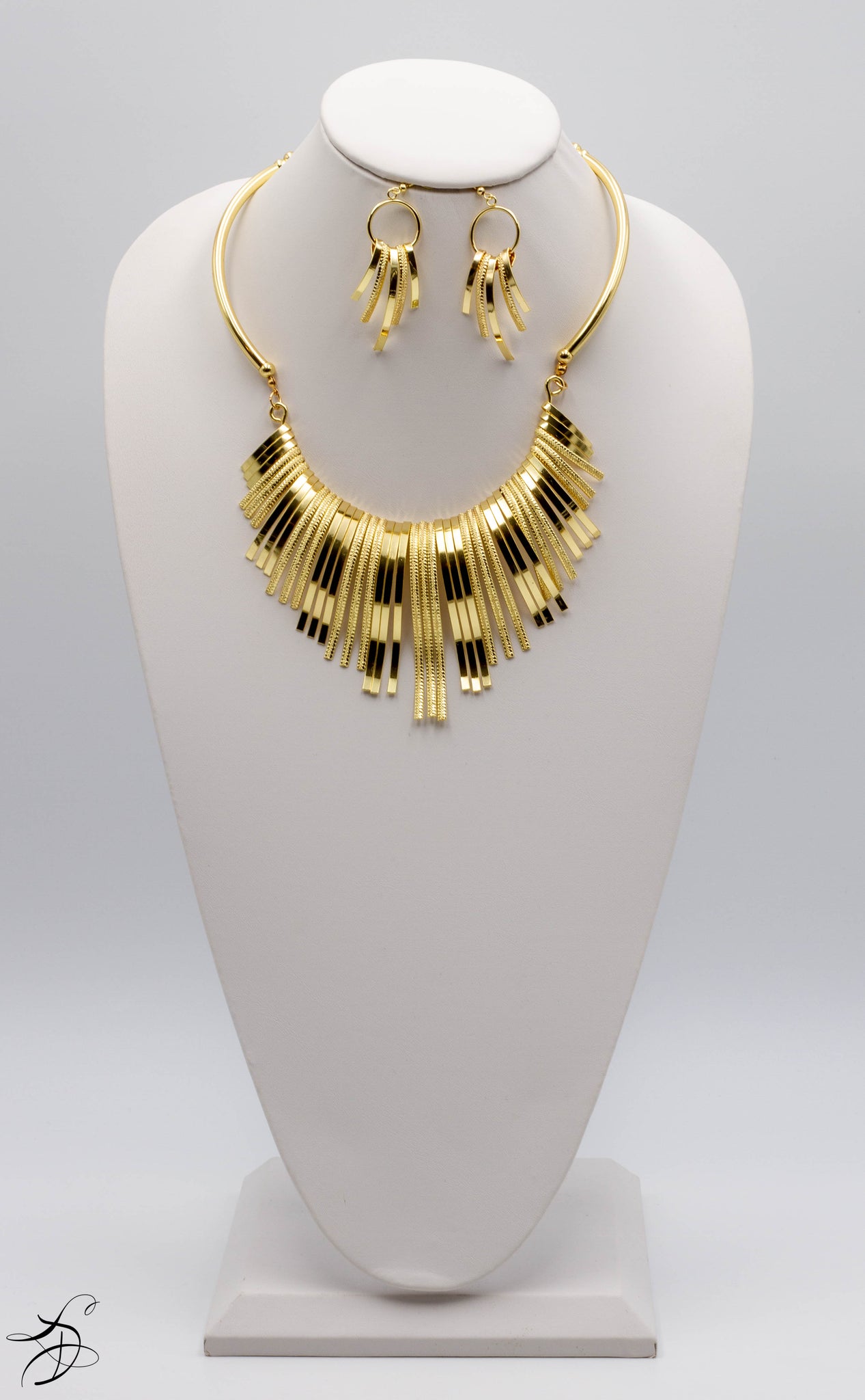 SHINNY GOLD CHROME-PLATED ASYMMETRICAL TASSELS WITH MATCHING EARRINGS