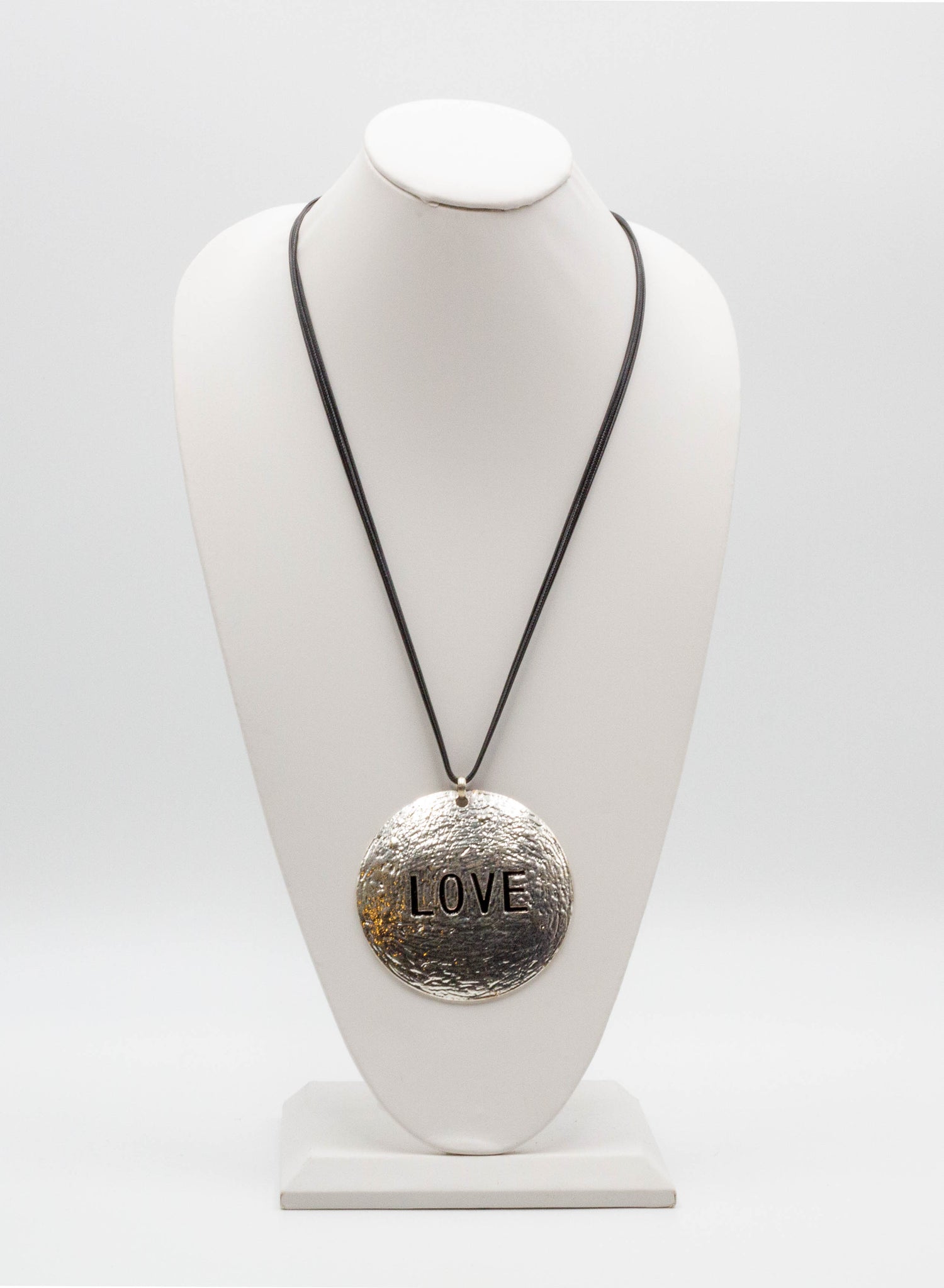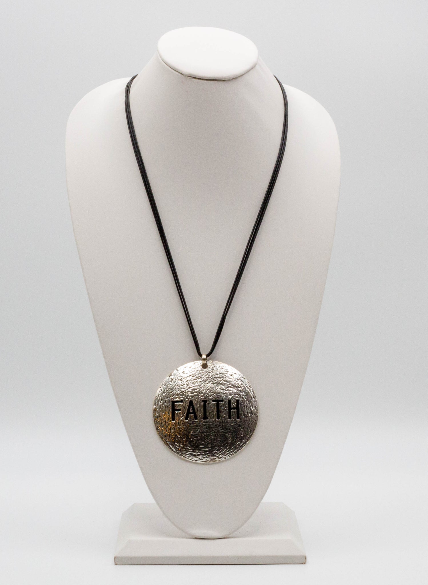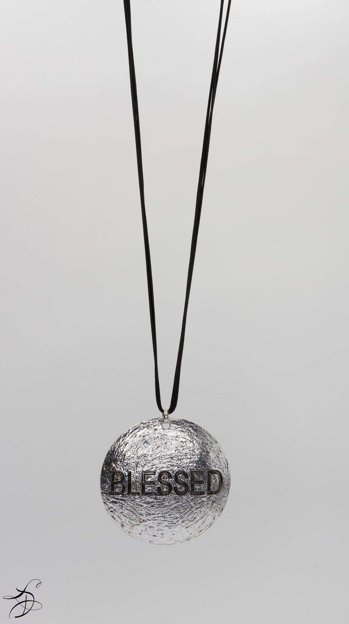 LISA D'S EXCLUSIVE INSPIRED COLLECTION - 3 1/2 INCH SILVER HAMMERED METAL SPHERE WITH THE WORDS BLESSED, FAITH OR LOVE IMPRINTED IN BLACK ATTACHED TO WITH 16 INCH BLACK CORD.