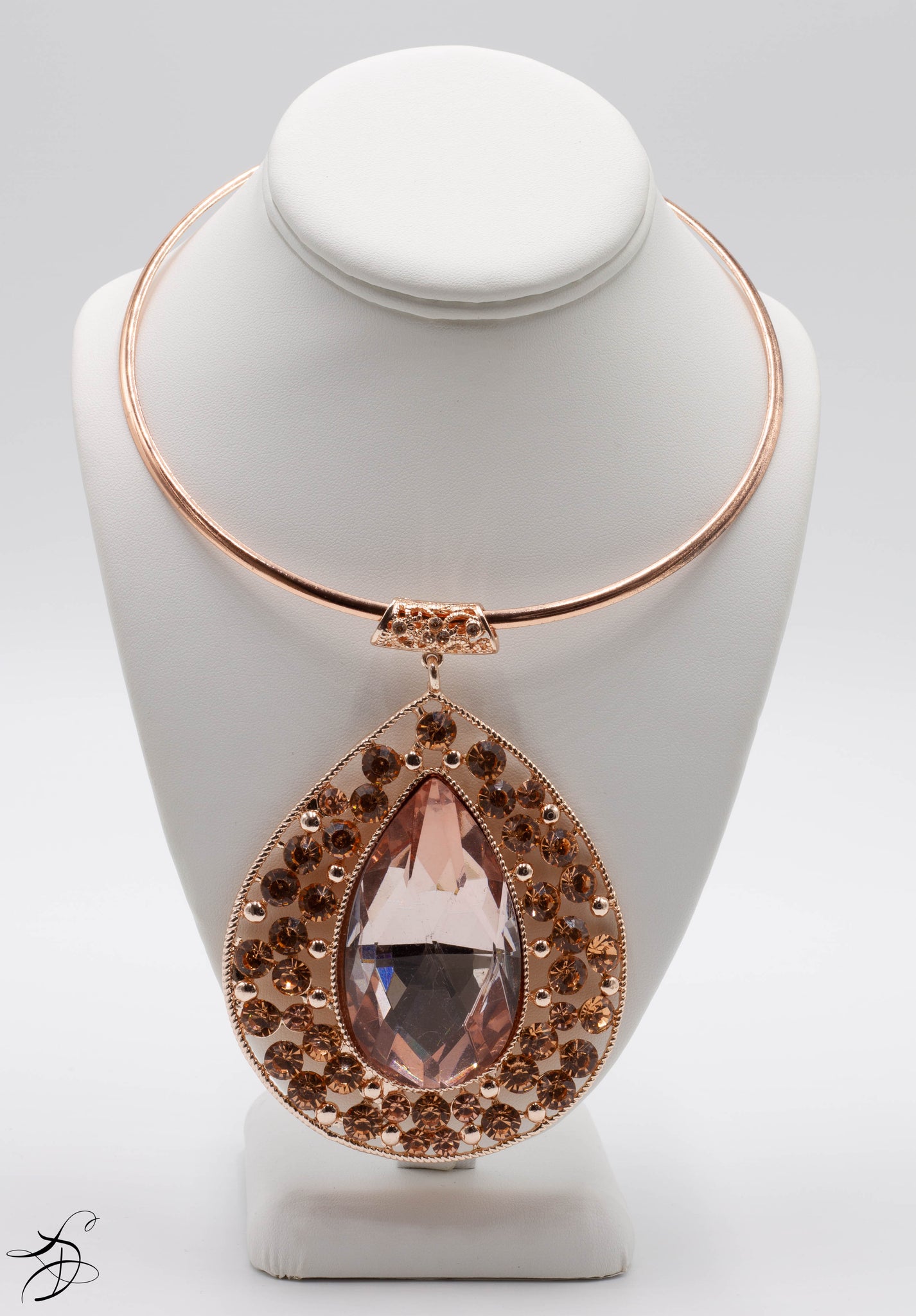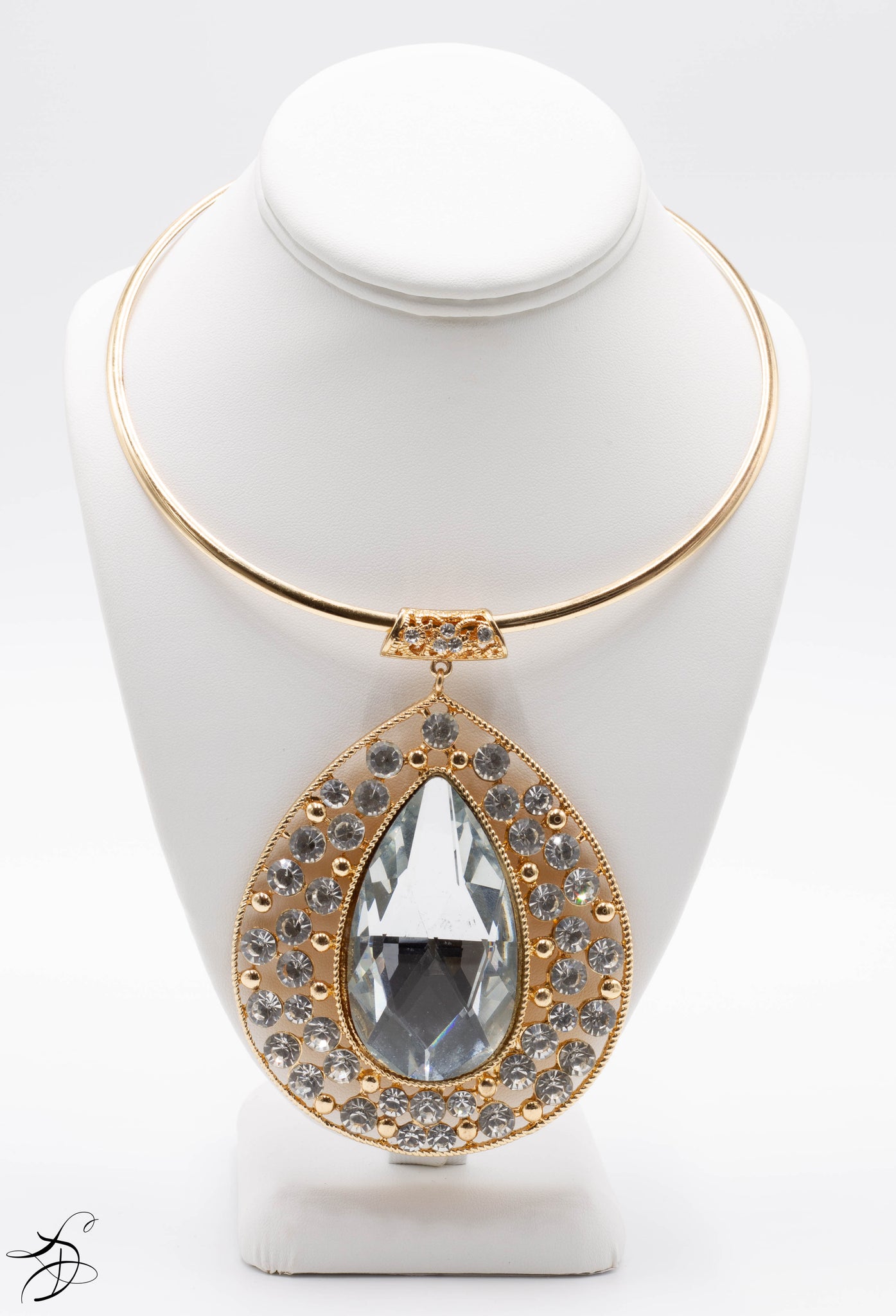CHOKER NECKLACE: CRYSTAL FACETED GLASS TEAR DROP JEWEL IN GOLD PLATED SETTING SURROUNDED BY CLEAR RHINESTONES.