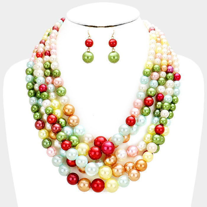 5 STRAND MULTI COLORED FAUX PEARLS NECKLACE SET WITH MATCHING PIERCED EARRINGS - THIS COLORFUL ENTOURAGE OF SOFT PASTELS MIXED WITH POPS OF PEONY PINKS, SOFT RED WINES AND FUCHSIA TONES ALL INTERTWINED INTO A FABULOUS MUST-HAVE MASTERPIECE IS RUNWAY READY. THIS NECKLACE SET PAIRS WELL WITH COLORS SUCH AS MINT, CRANBERRY, GOLD, CREAM, BLUSH, PASTEL YELLOW, OR SAGE TO NAME A FEW.